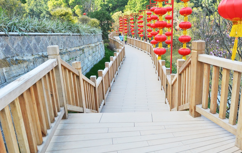 金强TKK栈道板与传统防腐木、竹木、木塑等相比具有更高强的抗冲击性能及耐候性、耐磨、耐腐蚀等特点,运用于高盖山公园栈道中,可以减少因日晒、风、物等各种因素而产生的磨损,使用寿命更长久。