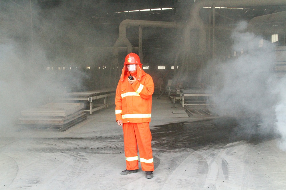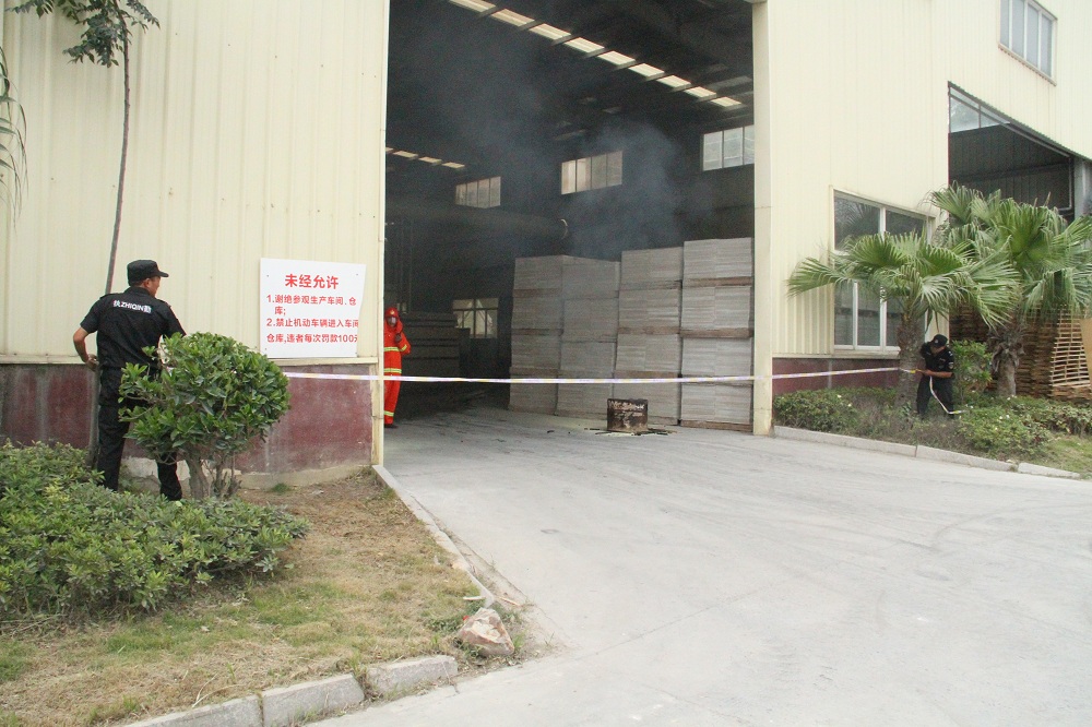 在演练中,通过模拟突发火灾事件,即氧气切割作业时,引燃了现场堆放的踏板木条,发生火灾。在听到呼喊声后,金强消防安全小组立即组织展开救援。保安消防队员立即进入火灾现场熟练的投入战斗,对生产车间人员进行紧急疏散,控制现场火势,并由安全专员拨打电话通知火警119,报失火地点,火势,火灾类型等情况,同时报告主管上级领导。