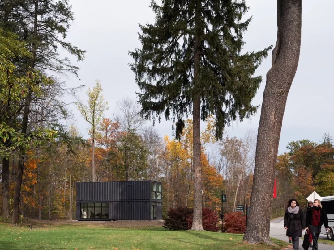 巴德学院实验人文的实验室由4个预制模块化建筑制成。实验室位于校园中心靠近弗兰克盖里音乐厅的位置,只花了半天时间就组装完成达到如图所示的外形,数周之后即投入运行。双重高宽的布局将主空间扩展到15英尺款17英尺高,上下两层的办公面积共计960平方英尺。