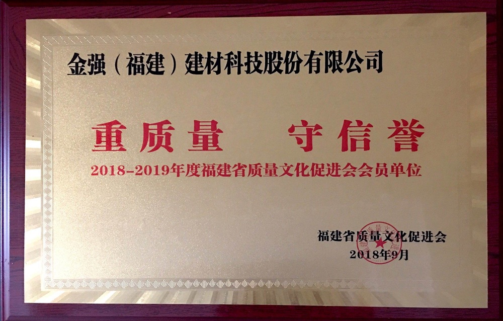 金强建材自创立以来,始终恪守诚信经营的理念,不断规范和细化合同管理,近年来,还曾获得过“2014-2015年度福州市守合同重信用企业”、“2018-2019年度福建省质量文化促进会‘重质量、守信誉’会员单位”等相关荣誉。
