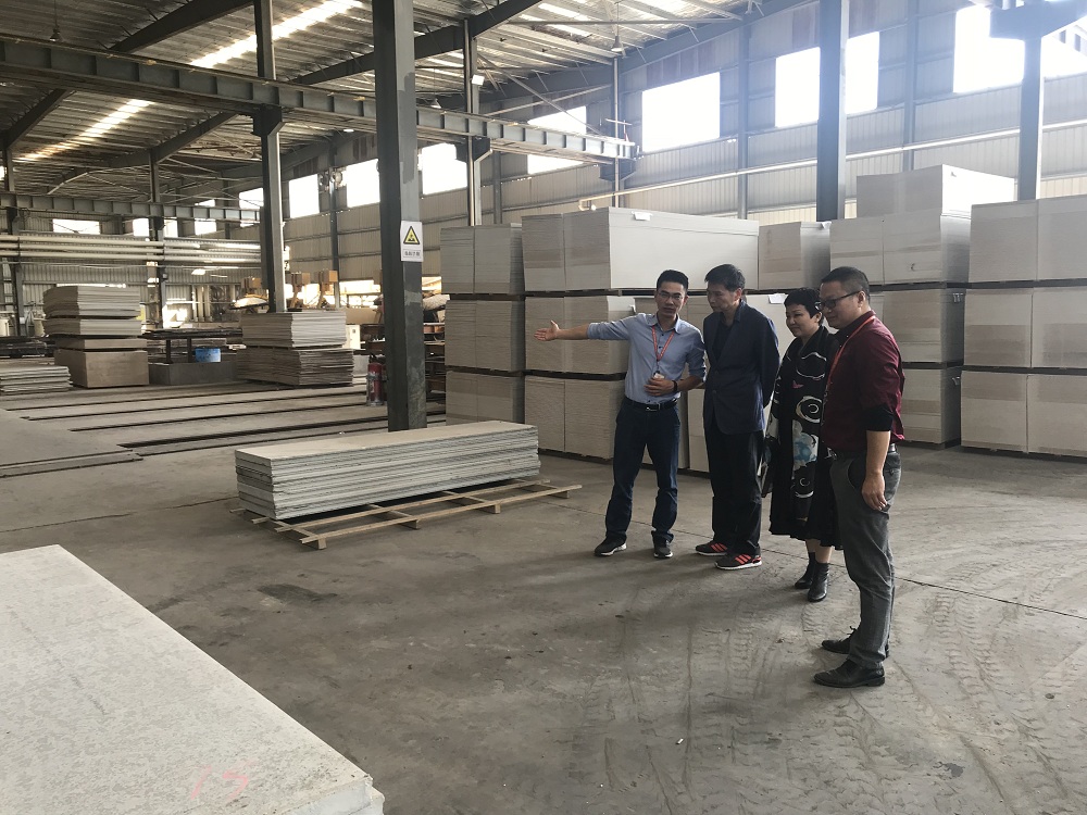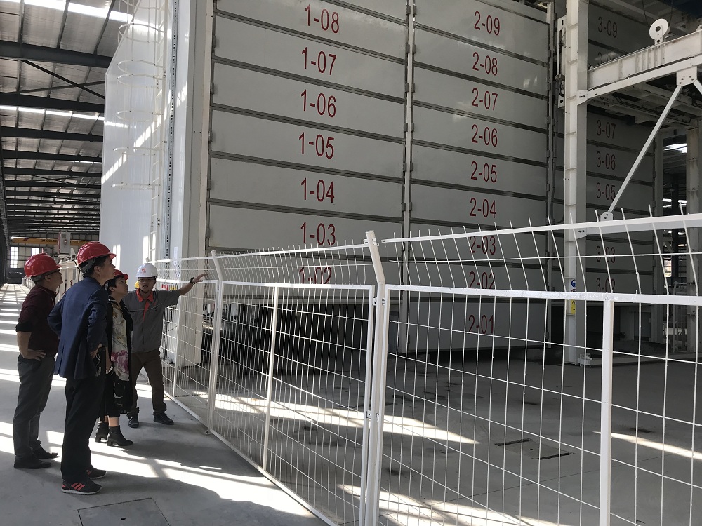 张学建处长首先参观了金强装配建筑产业园一期的绿色板材生产线,金强建材精益小组负责人苏鹰明结合目前国内外新型绿色建材的产品特点向其介绍了金强国际先进的智能化生产系统及相关产品特点、工艺等情况。考察过程中,张学建处长通过近距离观察生产线设备运转情况,进一步直观地了解绿色板材的生产运作流程。