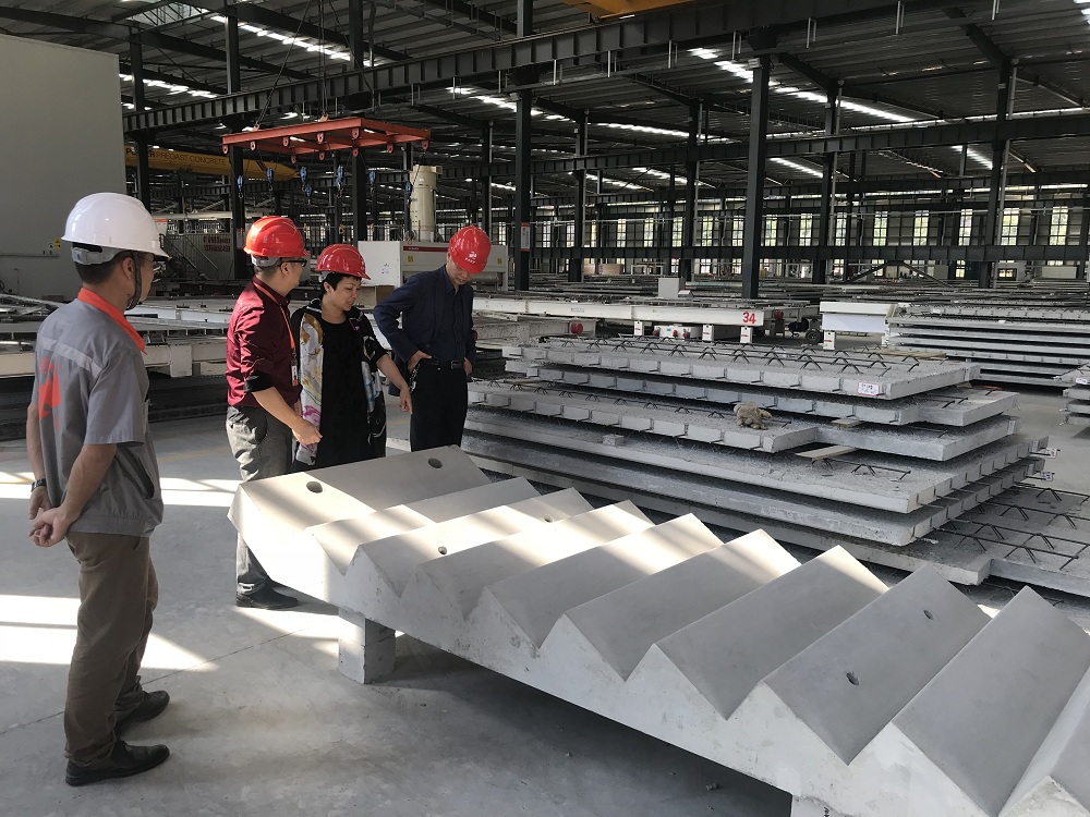 参观过程中,张学建处长重点了解装配式预制混凝土系统项目,现场观察堆放的预制PC构件成品,并就预制PC构件的产品运输、施工特点等问题进行详细询问。金强控股集团知识产权中心王爱群总监等人结合装配式建筑行业发展情况和未来趋势,积极解答。