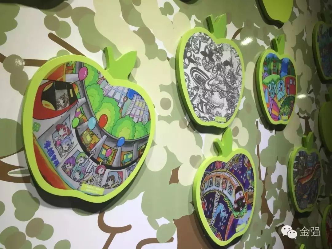 ▲ 金强彩绘板和雕刻板共同制作出的苹果主题展示墙