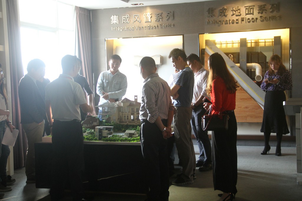当天,专家领导一行抵达金强后,首先在金强建材总经理黎忠的带领下参观人文建筑馆。参观过程中,专家领导一行详细询问了金强装配式一体化修系统的性能优势、施工特点等,在金强技术人员的详细解说下,了解金强的绿色板材系统、装配式围护结构系统、集成系统、装配式部品部件等具有防火等级A1级不燃性,可缩短工期、节能环保等优势。