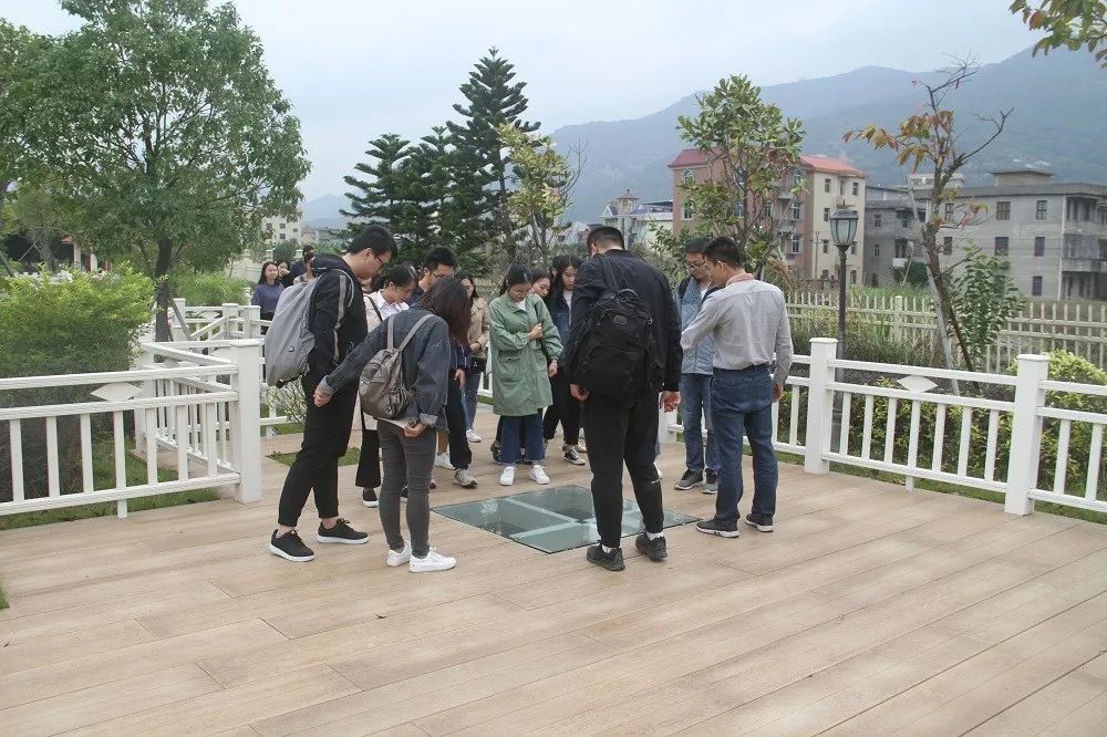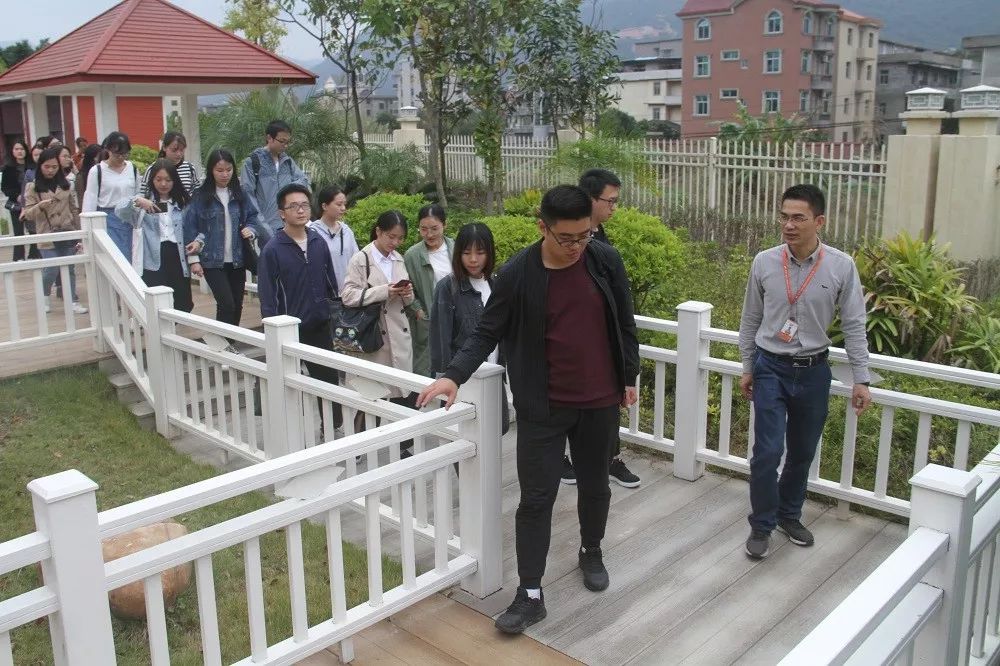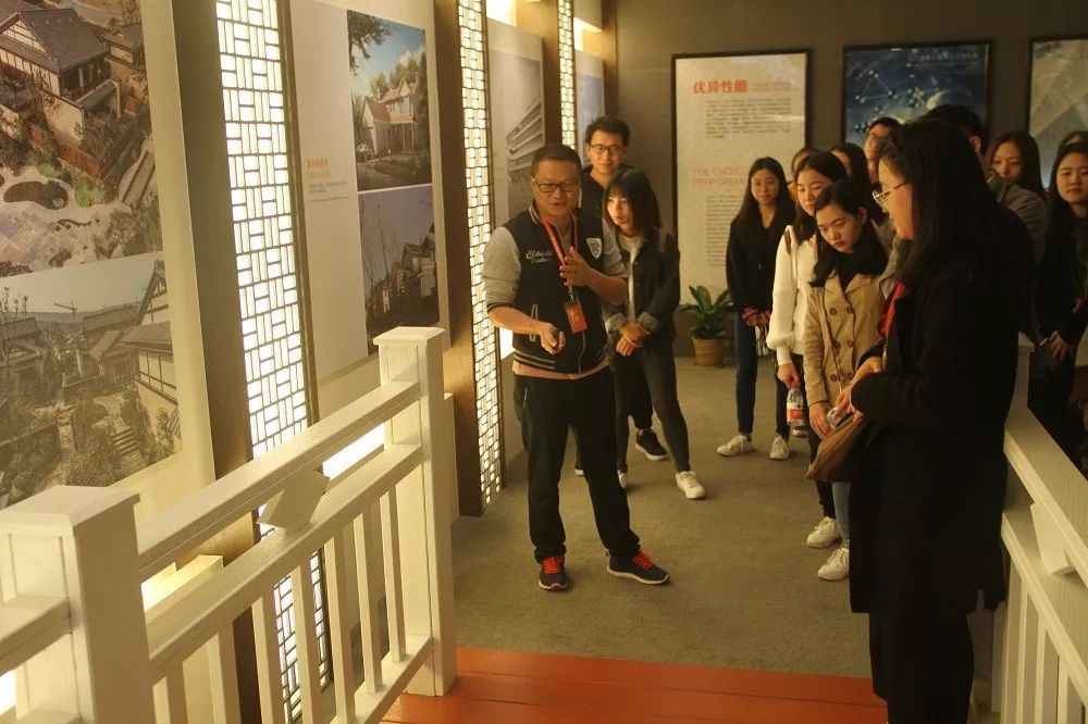 ▲金强建材精益项目负责人苏鹰明带领同学们参观金强板材公园,详细解说金强产品的实际应用