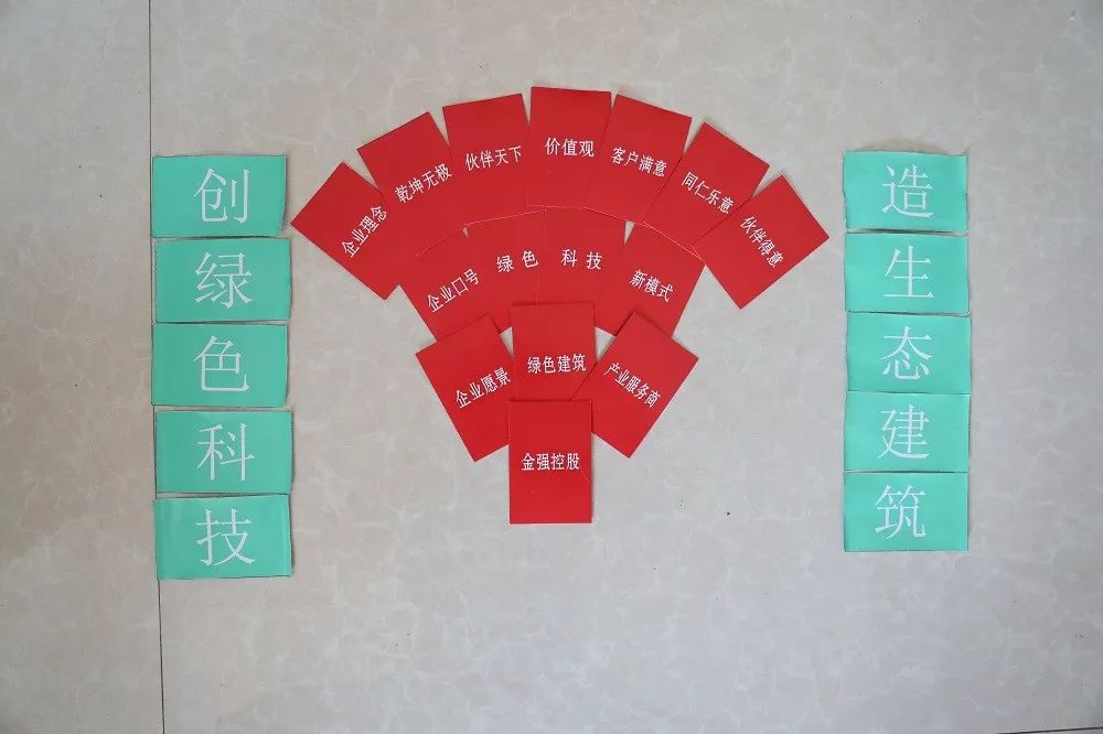 在训练项目“卡牌风云”、“极速前进”、“艰难使命”中,将金强控股集团企业口号:“绿色、科技、新模式”,企业使命:“创绿色科技,造生态建筑”,企业愿景:“打造中国专业的绿色建筑服务商”,四大产业:“绿色建材、装配施工、产业发展、工业管理”等企业文化内容相关字样设计融入道具或游戏任务中,加强参训高管对金强企业文化的领悟。