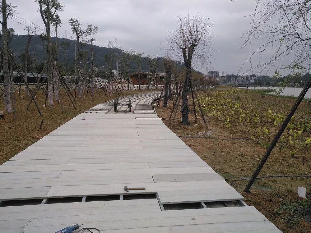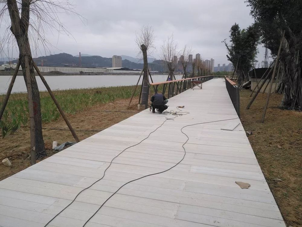 金强TKK栈道板与传统防腐木、竹木、木塑等相比具有更高强的抗冲击性能及耐候性、耐磨、耐腐蚀等特点,运用于洞江湖公园栈道和晋安区东郊河栈道中,可以减少因日晒、风、物等各种因素而产生的磨损,使用寿命更长久。