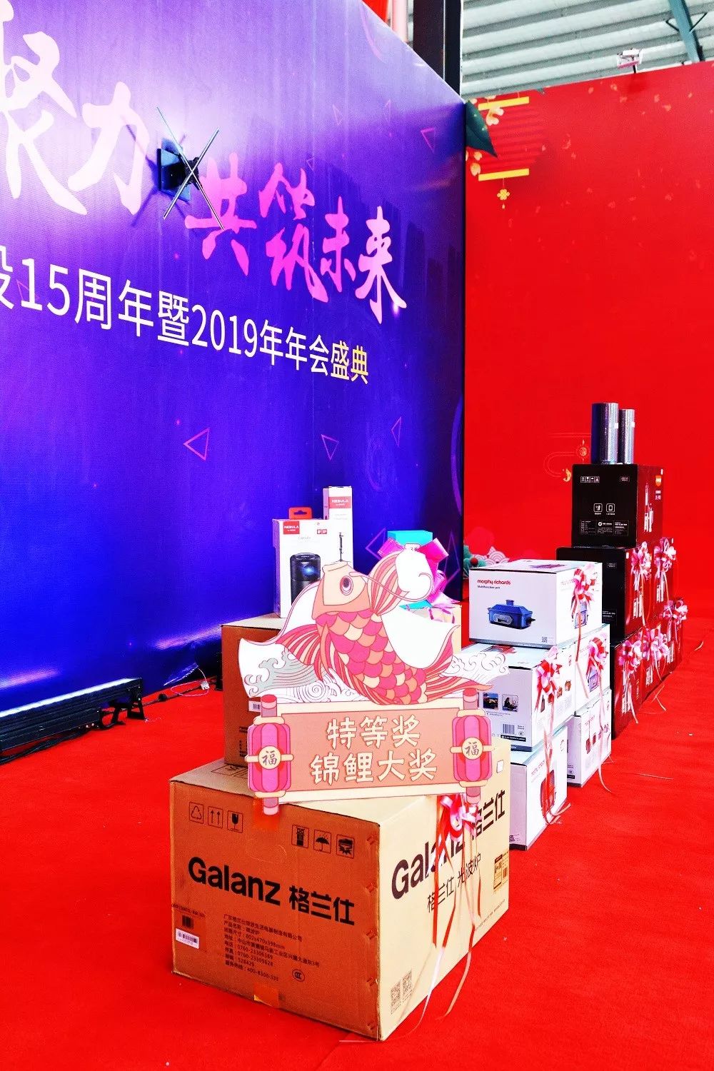 此次年会现场不仅在整体布局上大气美观,还在很多细节上围绕着金强控股15周年暨2019年年会盛典的主题特色。