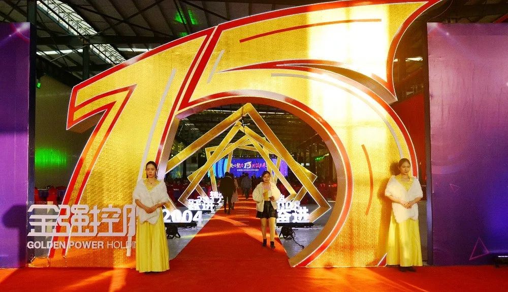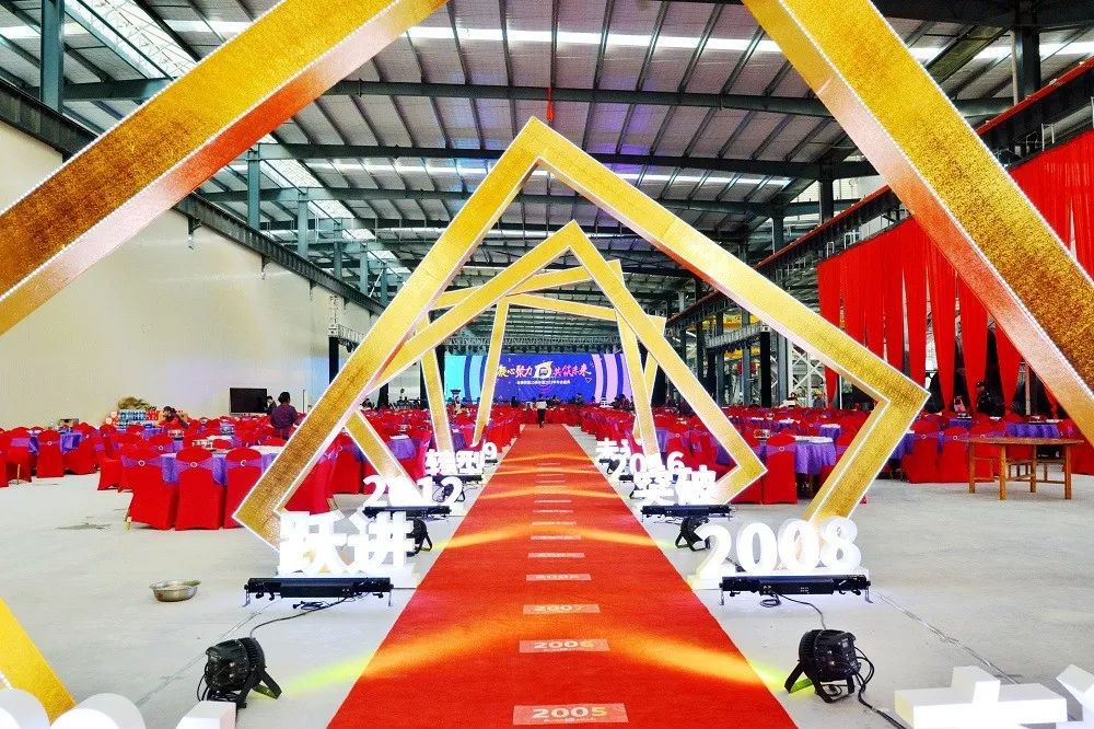 年会现场布置以15周年为主线,在入口处设置15周年门头,寓意走过15年,奔向新的华章。在时间红毯两侧展示金强从2004年的独立奋发、2008年的勇于突破、2012年的奋斗跃进、2016年的全面转型等标志性时间点和关键词。