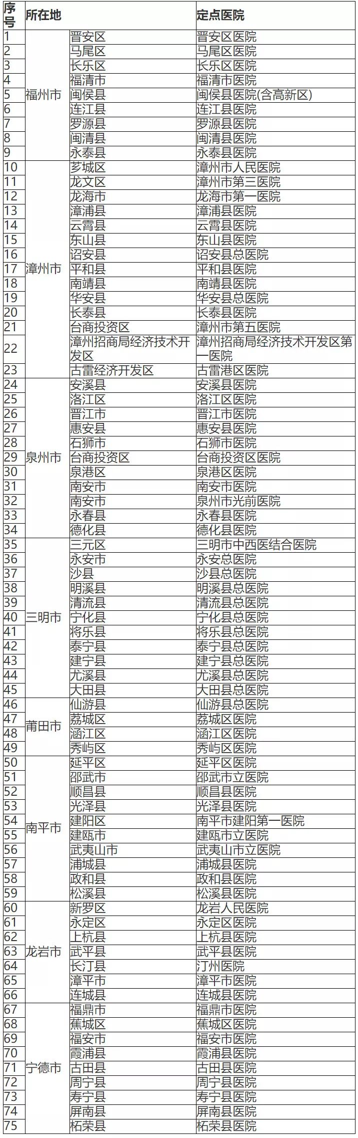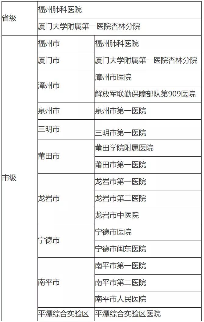 22日下午,福建省卫生健康委员会公布“福建省新型冠状病毒感染的肺炎救治省、市定点医院名单”及“福建省新型冠状病毒感染的肺炎救治县(市、区)级定点医院名单”。