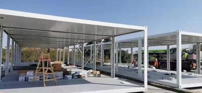当晚,现场已经完成多个模块化房屋的骨架安装。