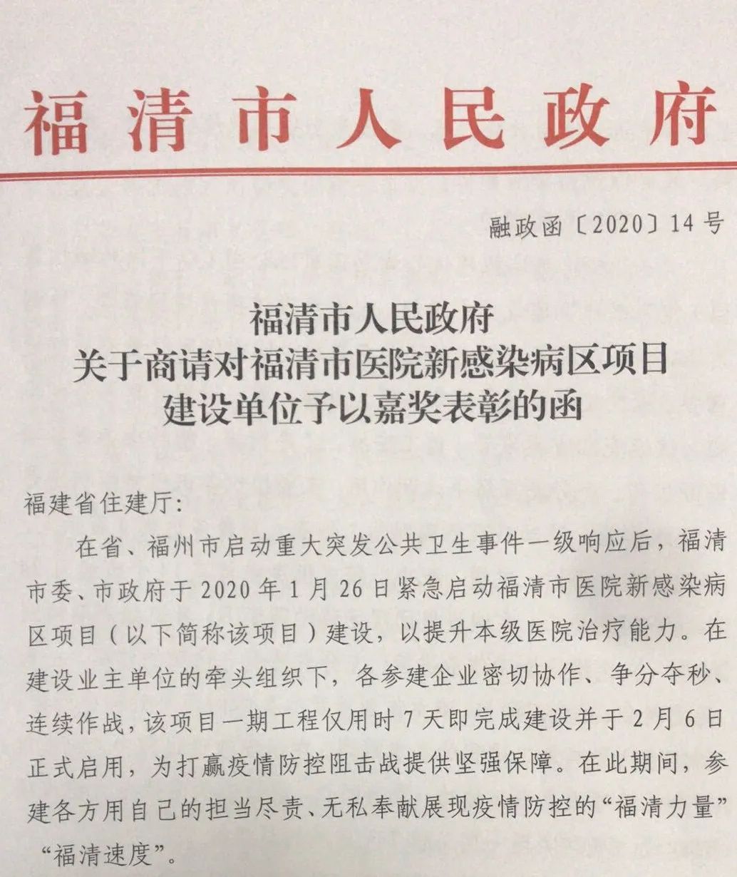 参建福清市医院新感染病区并圆满完成这项紧急而艰巨的任务,这对金强控股集团而言,是一次十分宝贵的经历。在和其他参建单位通力合作下,金强装配式模块化房屋发挥最大的优势,在项目建设中“抢夺”时间,保质保量完成任务。对此,福清市人民政府特向福建省住建厅商请对金强控股集团做出的突出贡献予以嘉奖表彰。