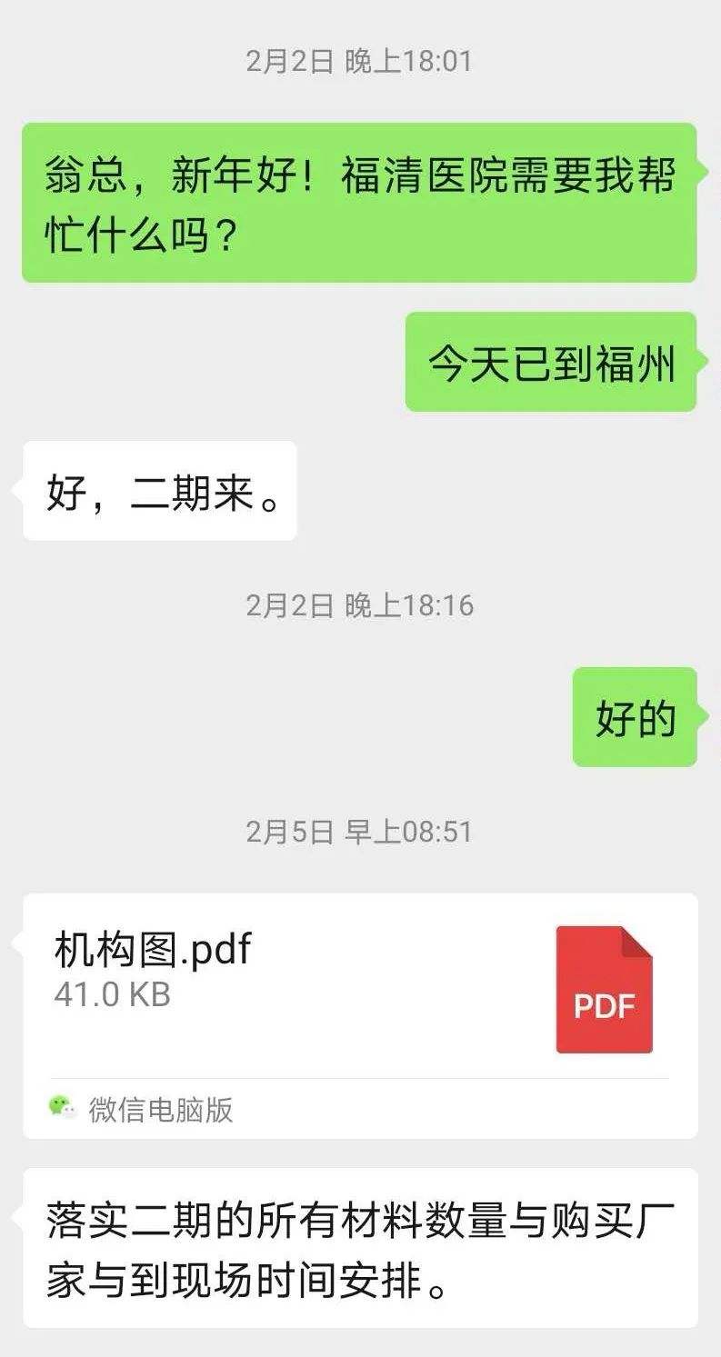 2月2日,福清市医院新感染病区项目正在紧张推进,在家休假的李道桂听说项目现场忙得不可开交,主动联系了集团总裁翁斌,希望能帮上一点忙。“2月4日晚接到翁总电话,让我去现场帮忙,第二天我就去了工地现场。”