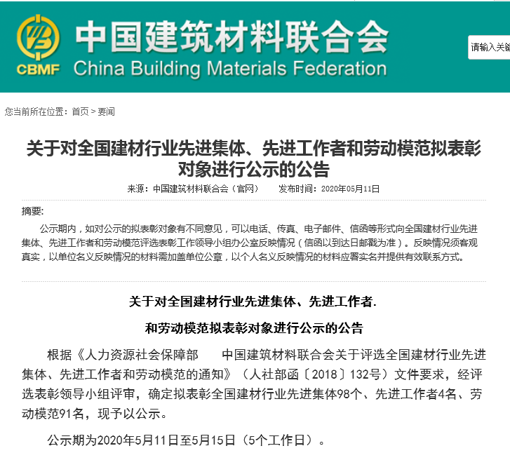 日前,中国建筑材料联合会公布了一批全国建材行业表彰先进集体、先进工作者和劳动模范名单,其中,金强(福建)建材科技股份有限公司荣登先进集体名单。