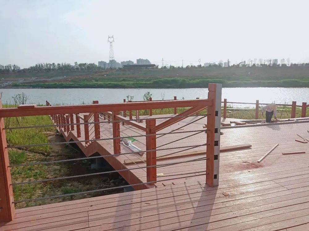 湖南敢胜垸浏阳河风光带作为一条缝合现代城市与自然水岸的生态绿锦,在设计时就秉承“生态、低碳、可持续发展”的理念,选用的金强TKK栈道板十分绿色环保,零石棉、零甲醛,是绿色建筑选用产品,符合该景观工程的要求,助力为市民打造一个兼具地方特色和人文特征的城市名片。