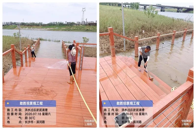 2020年入汛以来,湖南连遇多轮强降雨,部分地区遭遇洪涝灾害,湖南长沙敢胜垸浏阳河风光带的部分景观也在此次洪水中被淹没,尤其是位处较低的亲水平台,在洪水中浸泡了约二十多天。而在洪水退却后,在水中长期浸泡的金强TKK栈道板依然完好无损,未发生任何腐烂、发霉的现象,经过清淤后,短时间内迅速恢复景观风貌。