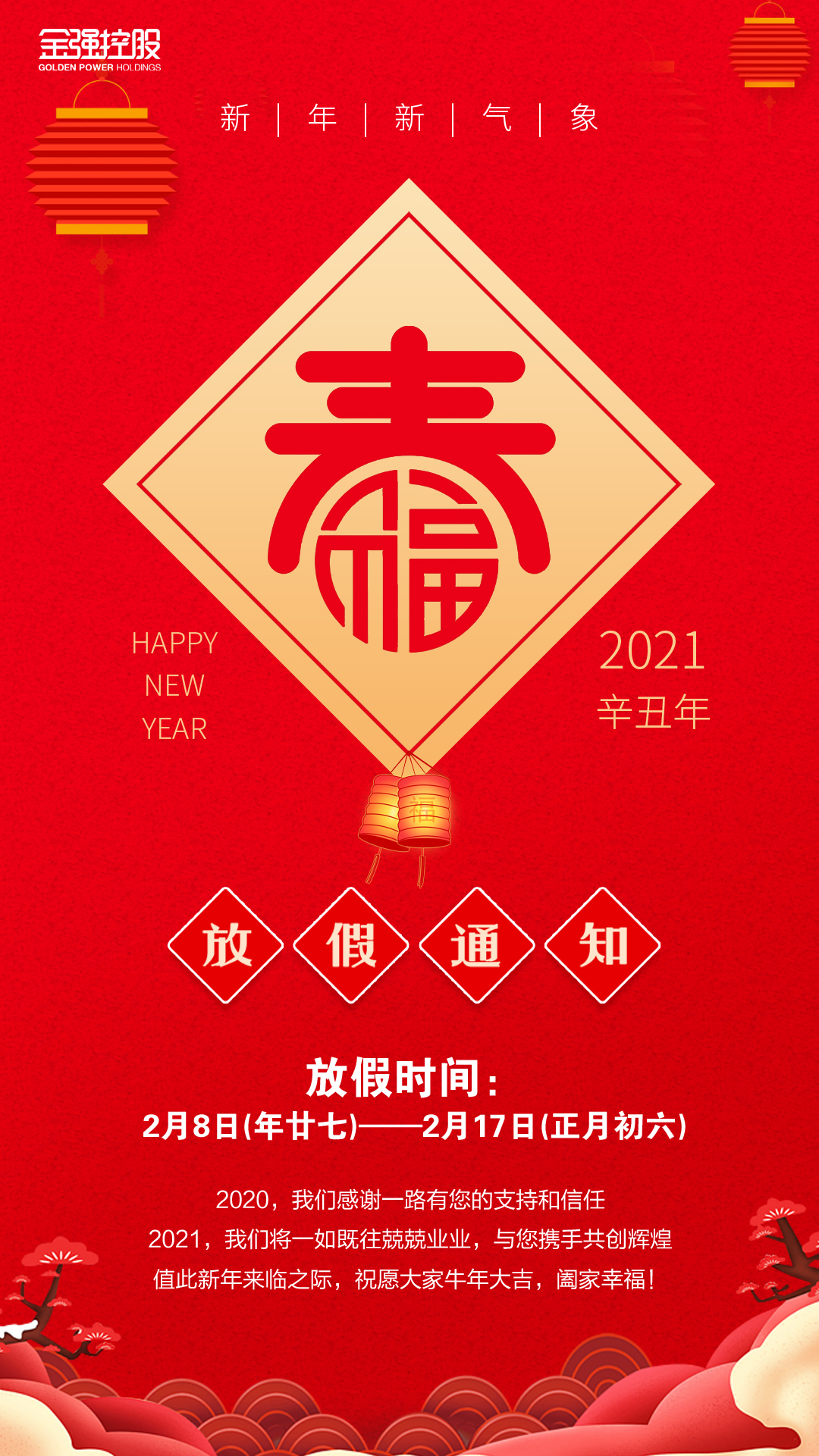 放假通知 | 金强控股预祝您新春快乐,牛年大吉!