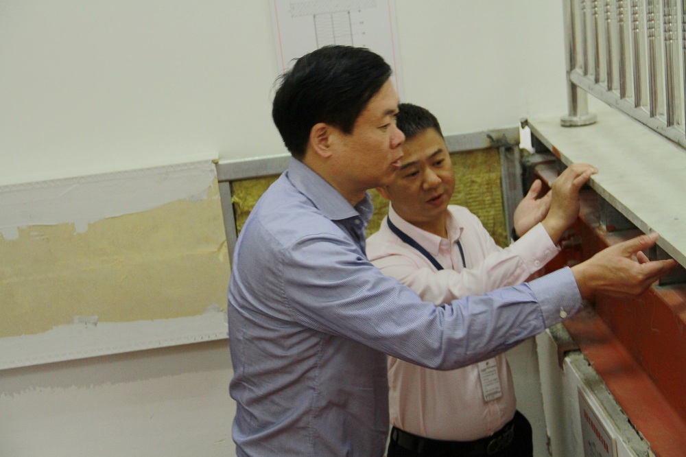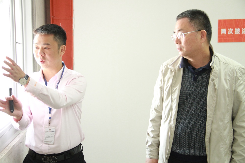 ▲福建省质检站站长黄力强(左一)与金强建材总经理黎忠和交流意见