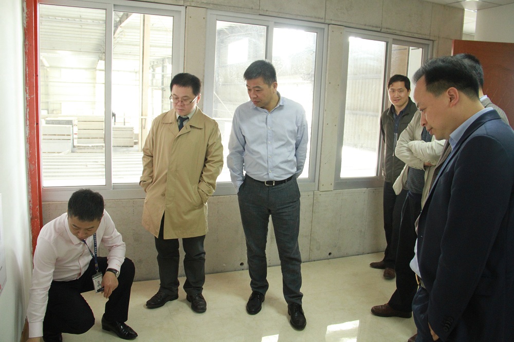 ▲福建省建设厅副厅长林增忠(右一)等人参观金强装配式围护系统示范楼