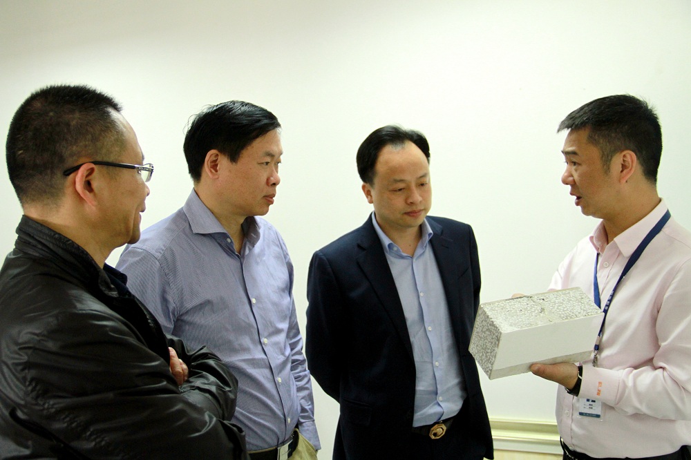 ▲金强建材总经理黎忠和向福州市市建委副主任郑鸿(左一)介绍金强装配式楼板