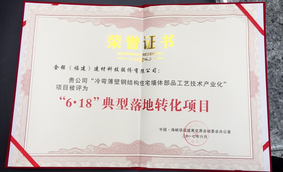 中国海峡项目成果交易会是项目、技术、资本与人才的沟通与碰撞,是福建省为广泛吸纳国内外科技成果与福建企业对接,加快科技成果向现实生产力转化而搭建的平台。在本次展会上,有一大批项目利用此次机会与资本对接,促进科技成果转化和快速落地发展。其中,金强建材的“冷弯薄壁钢结构住宅墙体部品工艺技术产业化”项目被评为“6•18典型落地转化项目”。荣获该荣誉的全省仅4家企业,金强位列其中。