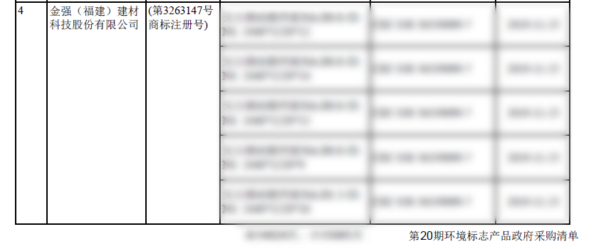 在第二十期《环境标志产品政府采购清单》中,金强(福建)建材科技股份有限公司共计有31款板材产品被列入。分别为轻质复合墙板FPB和无石棉硅酸钙板NA-D0.8-Ⅲ-NS 两种类型板材,其中,轻质复合墙板FPB涵盖244*61*10(CM)、244*61*12(CM)、270*61*6(CM)等共计16种尺寸规格,无石棉硅酸钙板NA-D0.8-Ⅲ-NS涵盖2440*1220*12、2440*1220*15、2440*1220*9等21种尺寸规格。