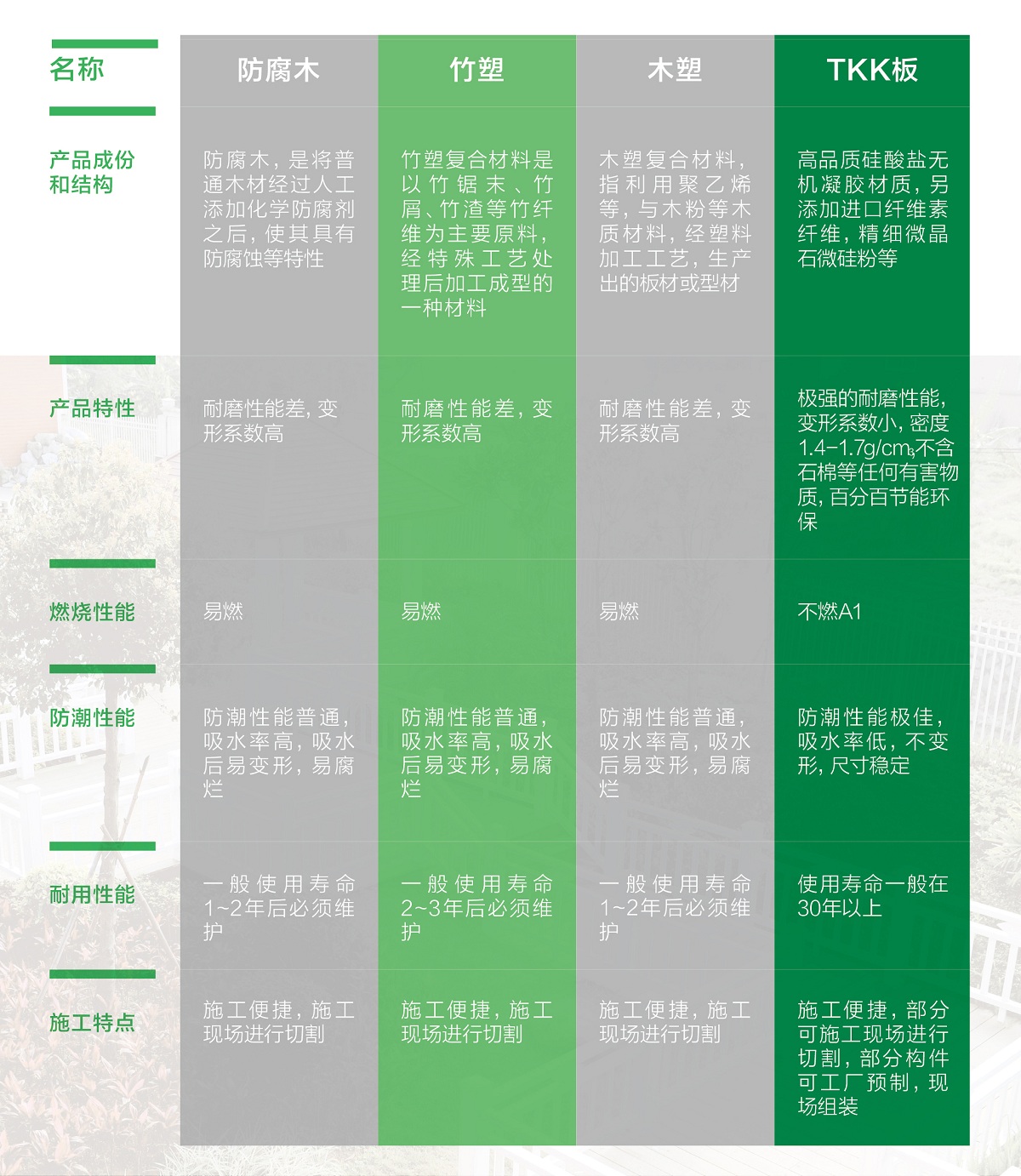 纤维增强水泥栈道板,如金强TKK栈道板,是绿色环保板材,以非石棉类无机矿物纤维、化学合成纤维或纤维素纤维、水泥、石英砂为主要基材,加入其它特殊材料,经过制浆、成型、加压、表面装饰制作、自然养护或蒸压养护而成,具有强度高、可加工性好、防腐蚀、防霉变等优异性能。