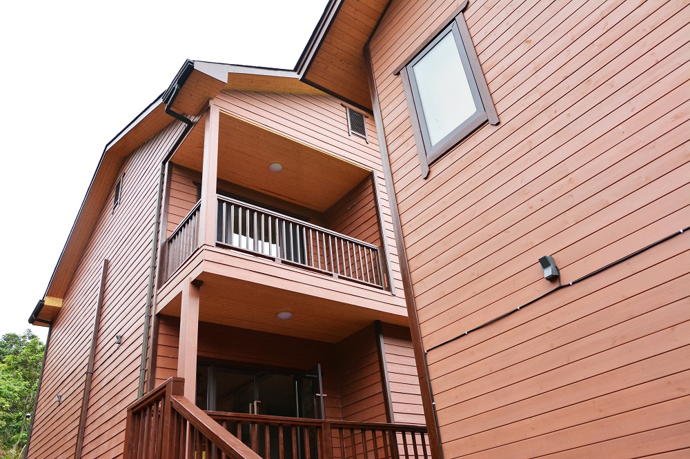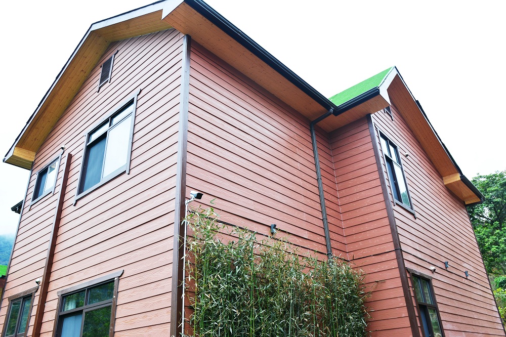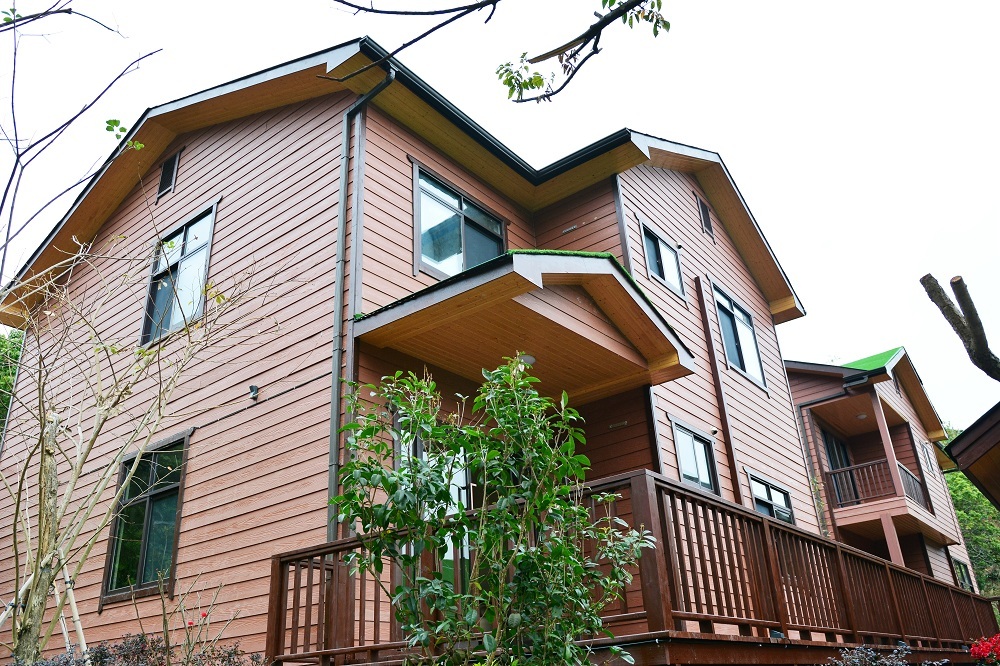 神龙谷景区内的别墅采用了金强披叠板。金强披叠板具有真实的木纹浮雕效果,表面喷涂仿石漆或外墙漆等装饰材料,外观优雅,绿色环保。