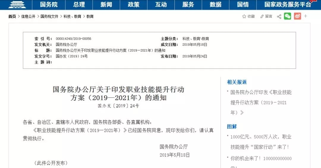 5月24日,国务院印发《职业技能提升行动方案(2019—2021年)》。