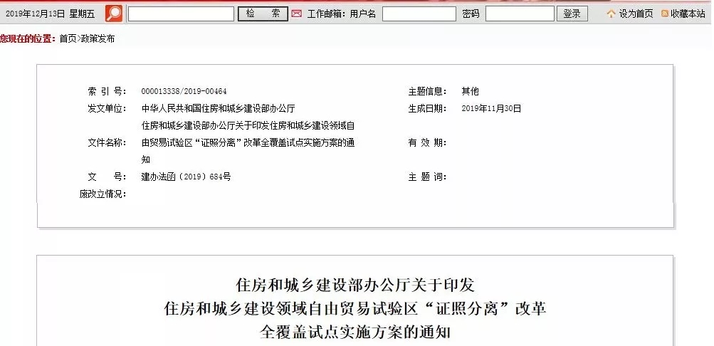 11月30日,住房和城乡建设部印发住房和城乡建设领域自由贸易试验区“证照分离”改革全覆盖试点实施方案的通知。