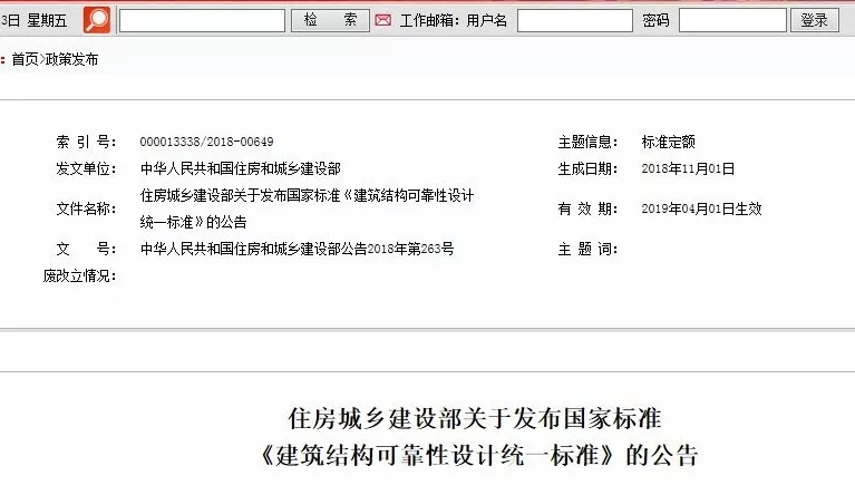 住房和城乡建设部关于发布国家标准《建筑结构可靠性设计统一标准》的公告。