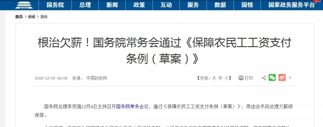 12月4日,国务院常务会议通过《保障农民工工资支付条例(草案)》,强调各级政府和国有企事业单位不得以任何理由拖欠农民工工资。要在前期专项整治基础上,用法治手段推动根治拖欠农民工工资问题。