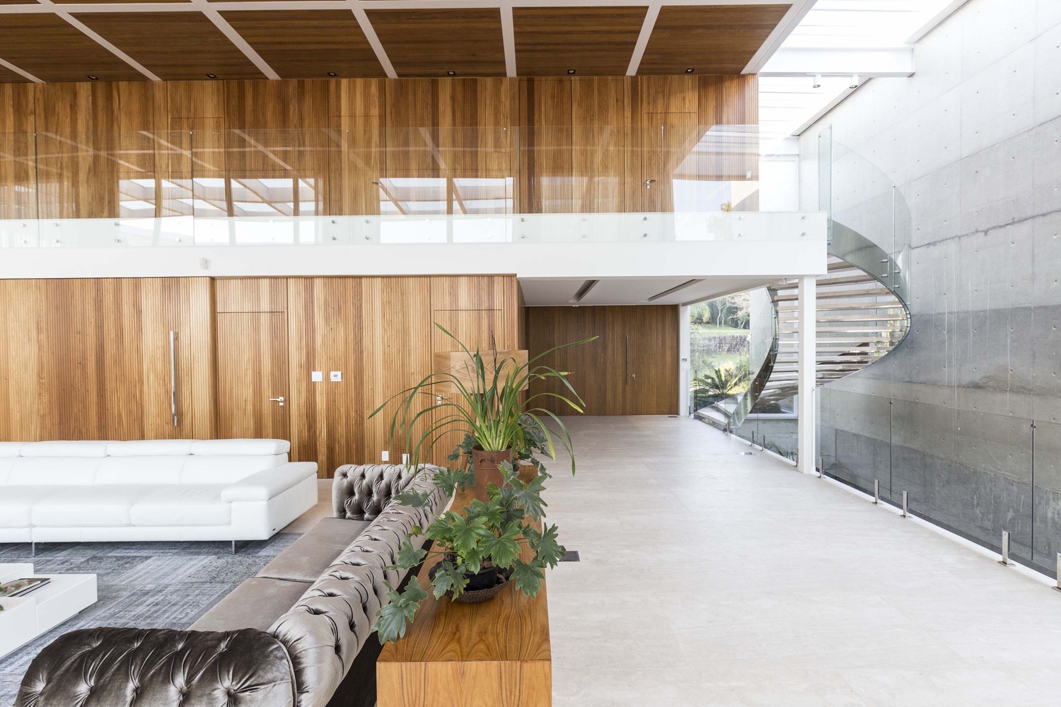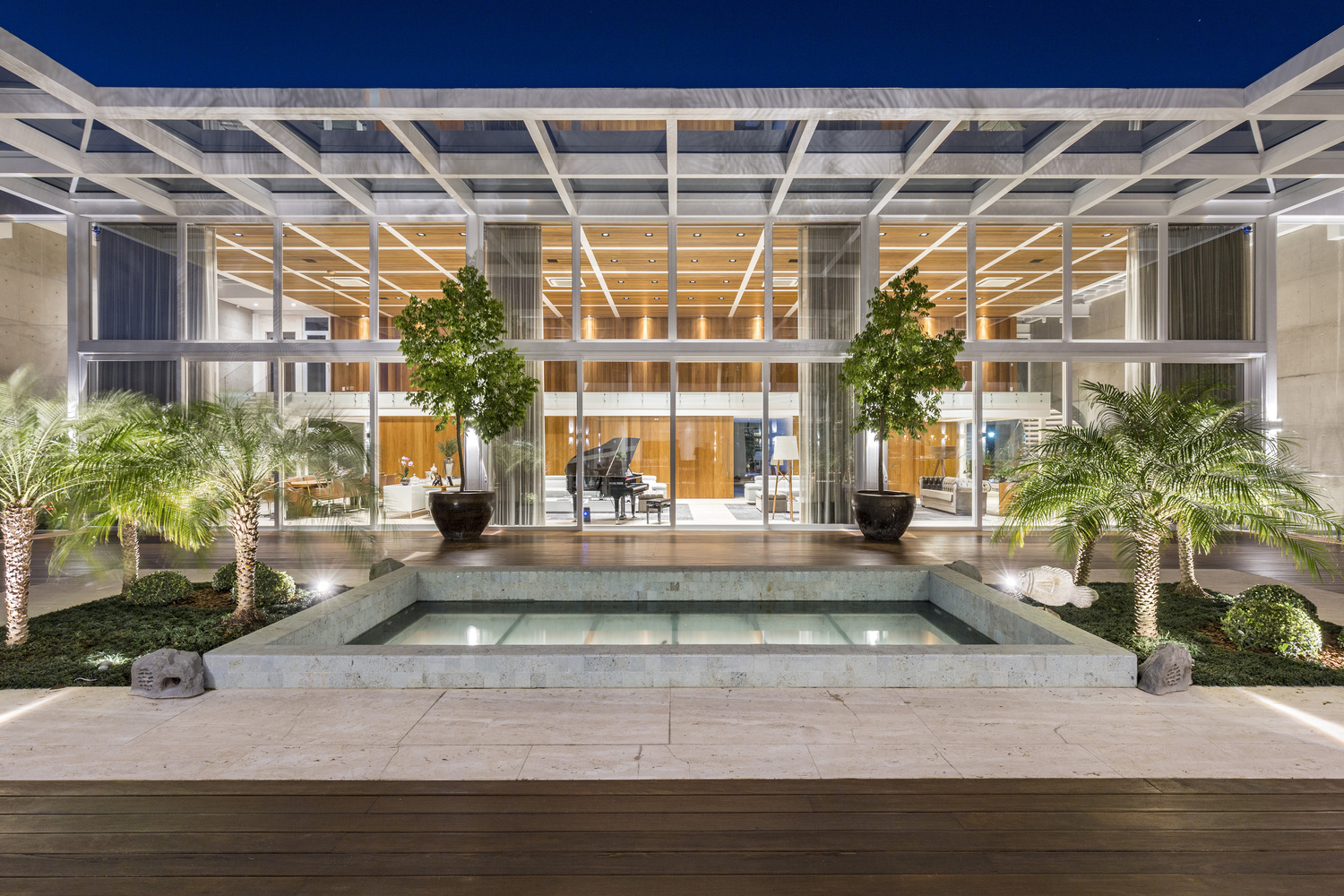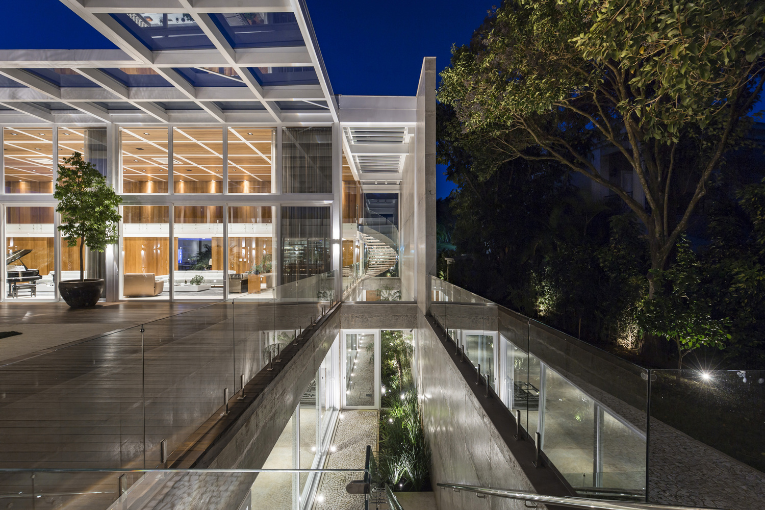 南立面双层高的玻璃窗为整个起居室提供了欣赏Lake Guaíba绝佳的的视野。北立面的悬臂梁和遮阳板避免了阳光直射,这也是四个卧室被安排在背面的原因。从屋顶上延伸至庭院的钢架创造出一种房屋连接着室内外,并且自我伸展的感觉。