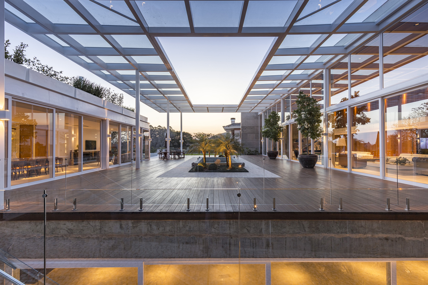 透光的玻璃屋顶将自然光线和内庭院的视野引入房间。小直径钢柱的钢结构使房间拥有大的空间跨度。整个项目基于190厘米乘190厘米的网架在屋顶结构中清晰可见。