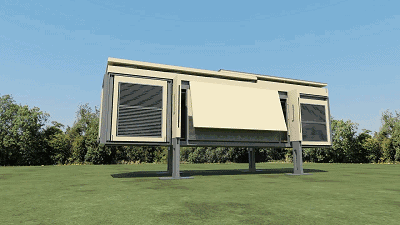 该模块化房屋极具特色:可以自动展开并部署房屋结构。整个过程不需要房屋建筑商介入,也不需要打任何房屋地基,仅需要不到10分钟的时间。