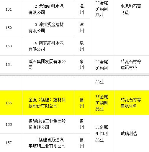 据悉,这次入选2018年福建省工业和信息化省级龙头企业(含子公司)共有358家,大类行业涵盖煤炭开采和洗选业、农副食品加工业、纺织业、计算机通信和其他电子设备制造业等35个大类行业。其中非金属矿物制品业共有16家,细分行业砖瓦石材等建筑材料领域共2家,其中福州地区仅金强建材1家。