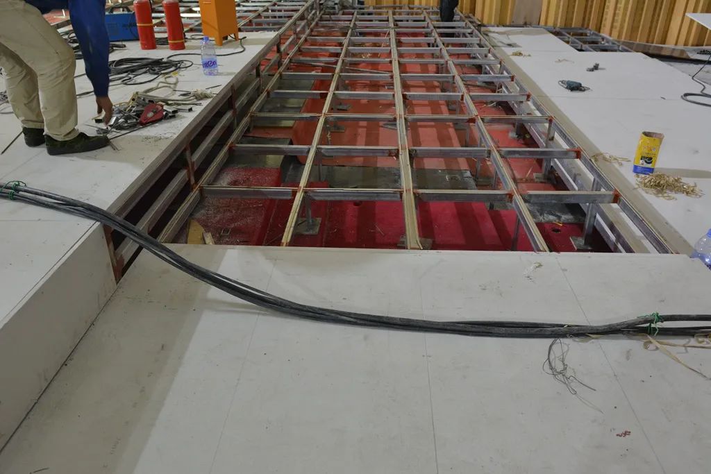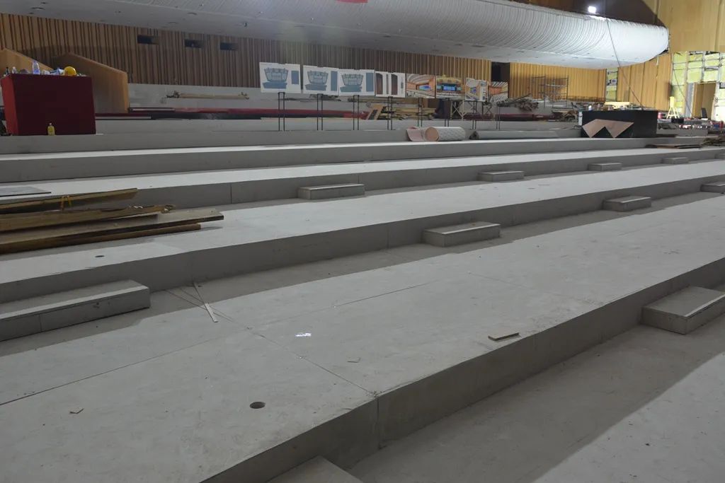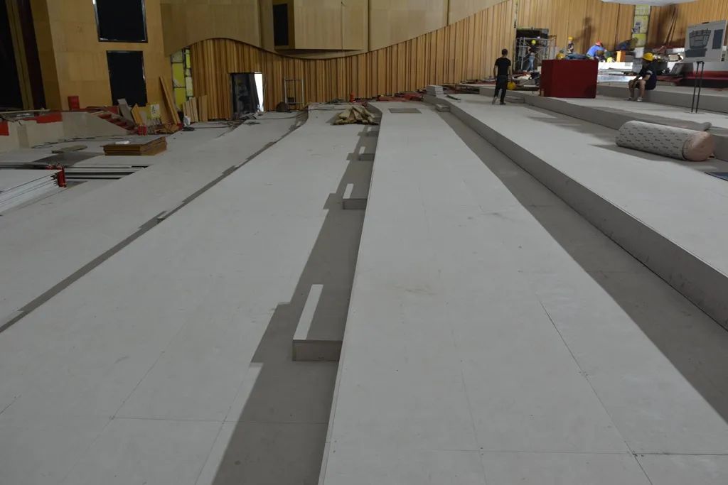 主会议厅在升级改造中重新选材,使用金强TKK板对地面进行了全新装修。金强TKK板,可替代传统现浇混凝土、钢筋桁架楼层板等湿法作业的楼板,可直接安装在钢龙骨上面,干法作业,施工便捷,同时又具有防火、防潮、抗冲击、隔音、抗震等优点。