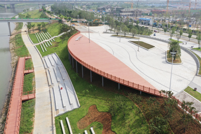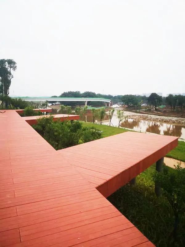 湖南敢胜垸浏阳河风光带作为一条缝合现代城市与自然水岸的生态绿锦,在设计时就秉承“生态、低碳、可持续发展”的理念,选用的金强TKK栈道板十分绿色环保,零石棉、零甲醛,是绿色建筑选用产品,符合该景观工程的要求,助力为市民打造一个兼具地方特色和人文特征的城市名片。