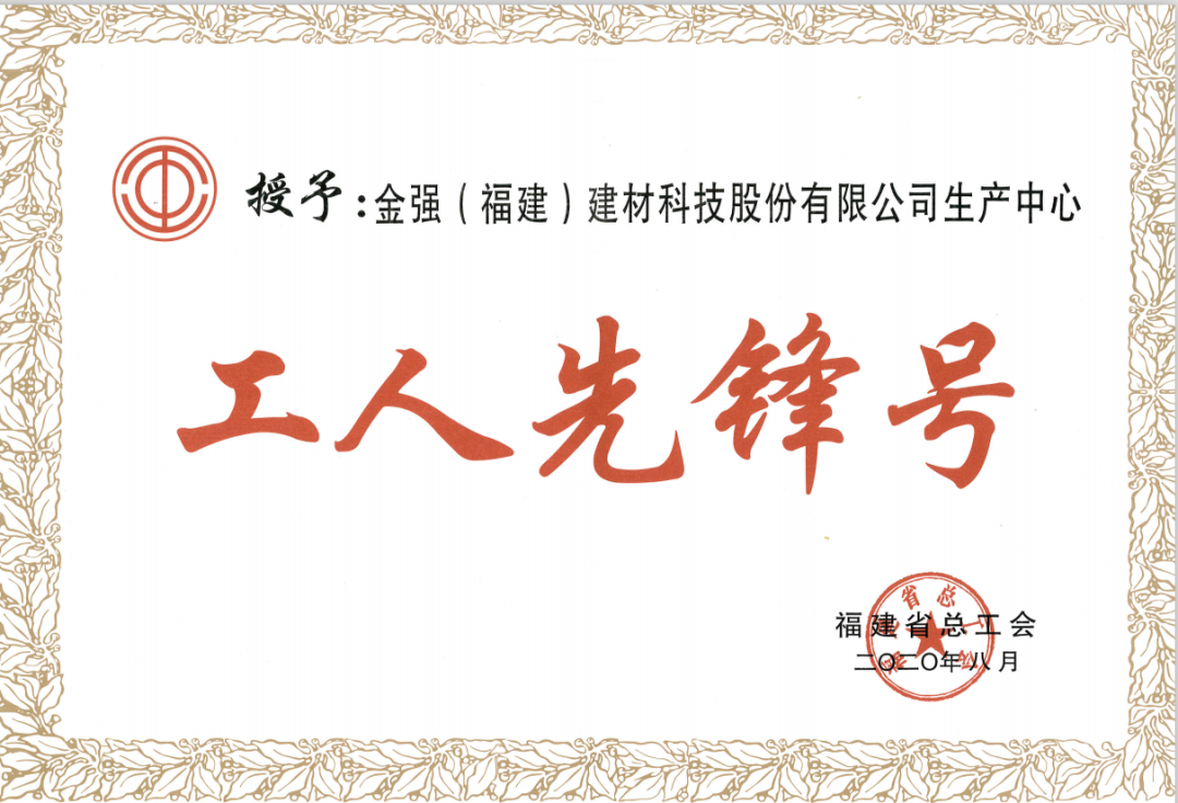 近日,福建省总工会下发《关于表彰2020年福建省五一劳动奖和福建省工人(五一)先锋号的决定》(闽工〔2020〕68号文),金强(福建)建材科技股份有限公司生产中心获评2020年“福建省工人先锋号”荣誉称号!
