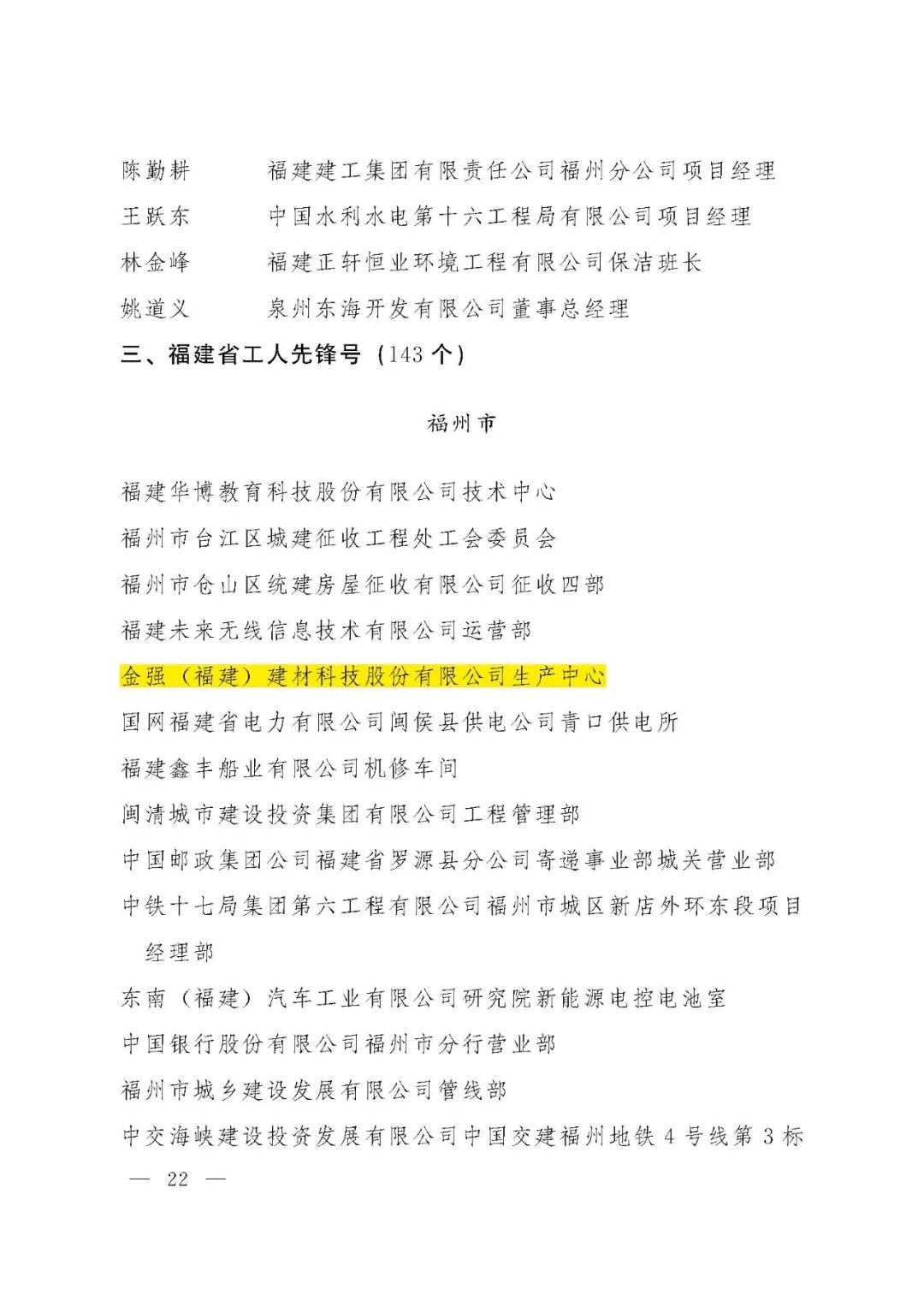金强建材生产中心获福建省工人先锋号