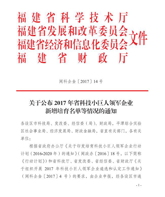 日前,福建省科技厅发布《关于公布2017年省科技小巨人领军企业新增培育名单等情况的通知》,金强(福建)建材科技股份有限公司榜上有名。